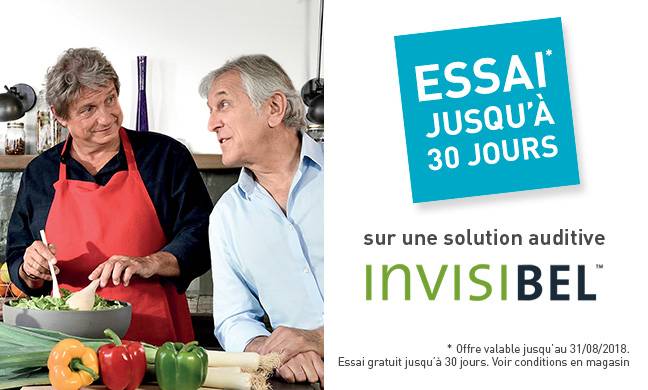 En complément de ces garanties, bénéficiez également d’un essai gratuit jusqu’à 30 jours d’une solution INVISIBEL. Cet essai, valable jusqu’au 31/08/2018, vous permettra de tester l’appareil auditif en condition réelle dans votre environnement.
